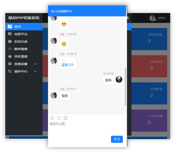 酷站PHP客服在线咨询交流系统框架使用thinkphp6/Mysql数据库基于workerman插件开发而成,降低个人、工作室、企业开发成本,快速提升客户服务效率和服务体验,客服系统支持多客服、排队、随机接待、发表情、发图片、发文件、历史消息、 离线消息、消息提醒、系统消息、在线留言、服务评价等功能,支持PC浏览器和H5移动端,只需要插入一段html片段即可快速接入现有系统,支持与现有系统用户对接,程序小巧使用简单,一建安装,更美观的用户界面设计.程序设计简单,操作清晰流畅所有页面自动适应电脑以及手机。